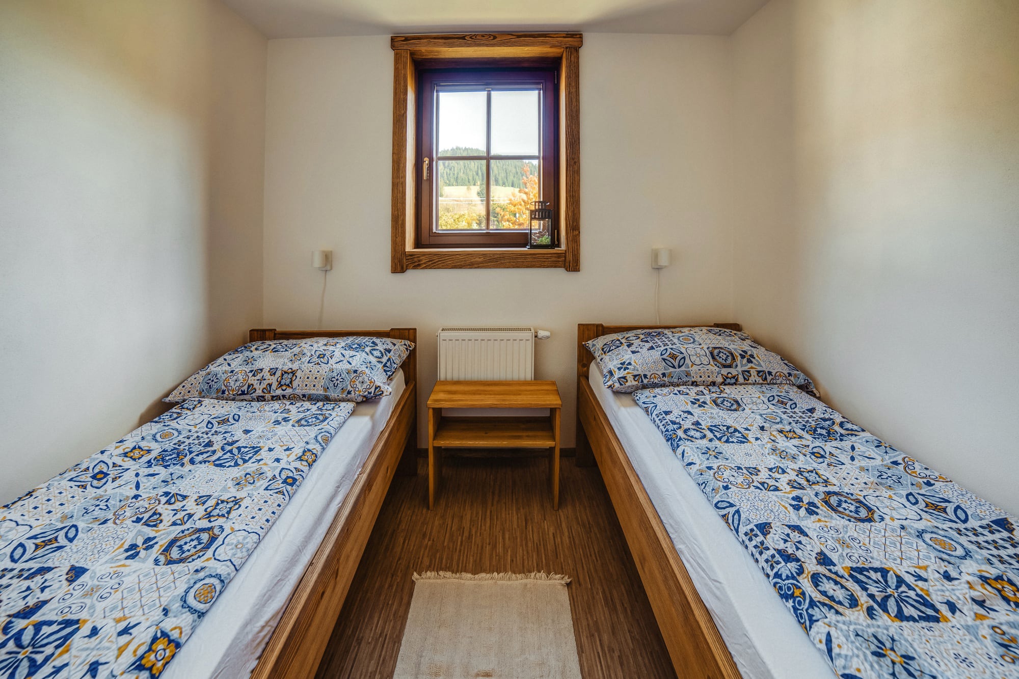 Byt obsahuje tyto místnosti: Kuchyň s vybavením a jídelním koutem, koupelnu s ručníky a dvě ložnice. Jedna s manželskou postelí a druhá s oddělenými postelemi.